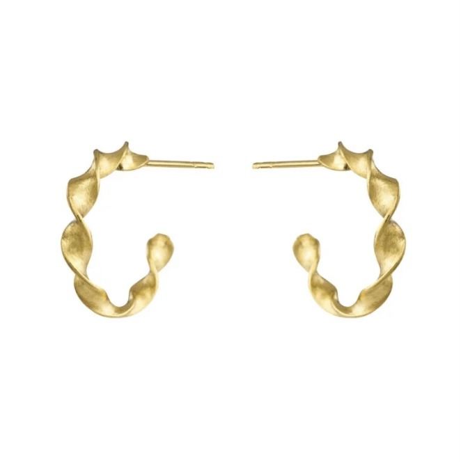 Tags: 18 krt goud op zilver, deens ontwerp, draagbare oorbellen, gedraaide oorring, matte afwerking, oorring, Susanne Friis Bjørner