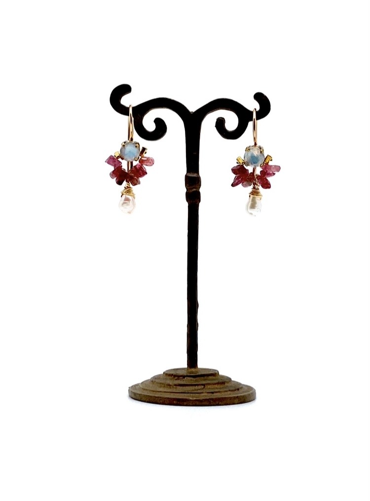 Handgemaakte oorbellen in een frisse kleurencombinatie van regenboogmaansteen, toermalijn en witte zoetwater parels.