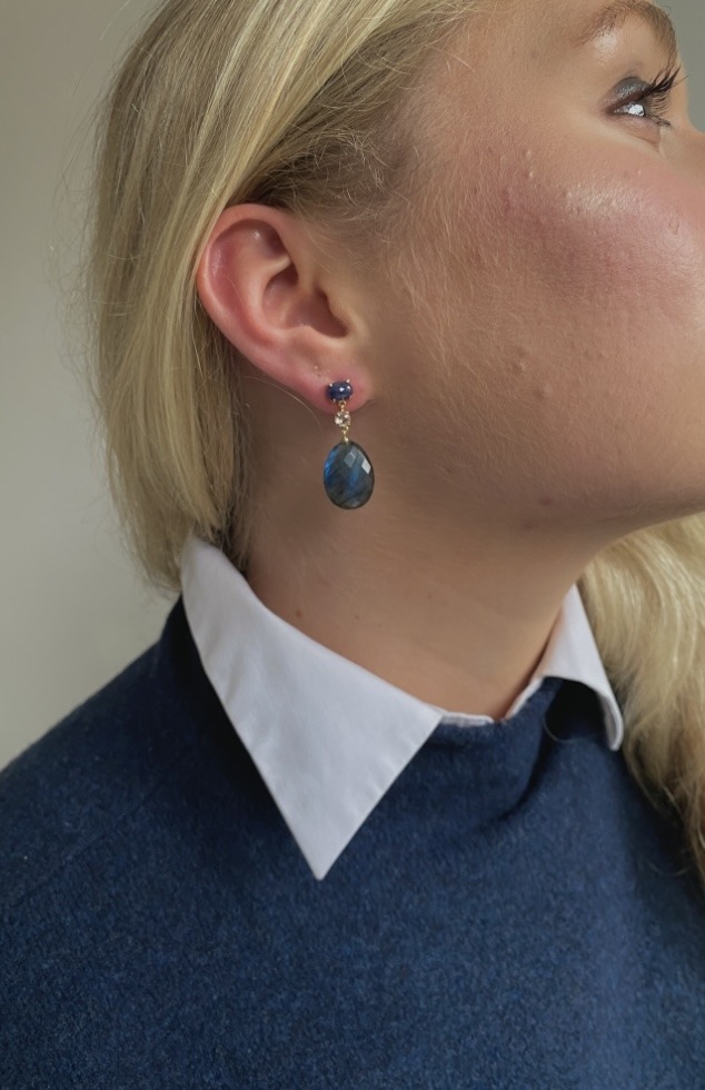 Deze handgemaakte oorbellen bestaan uit drie onderdelen, een royale blauw groene Labradoriet, blauwe Agaat en een witte zirkonia. Een prachtige Labradoriet in een druppelvorm geslepen in blauw en groen tinten. Een klassieke oorbel die prachtig staat bij een sportieve en klassieke outfit.